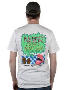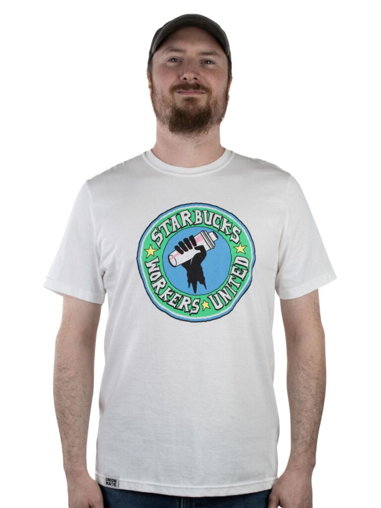 “Never Cross A Picket Line” graphic on back; “90s-Inspired SBWU logo” on front. Union-Made by Workers United. Union Printed. 100% of profits go toward the strike fund for union Starbucks workers. The size of the graphic and shirt color may differ slightly when printed.